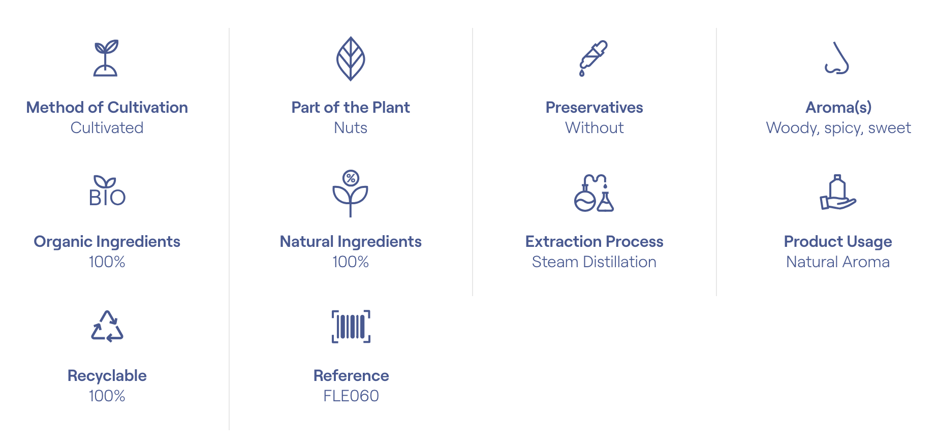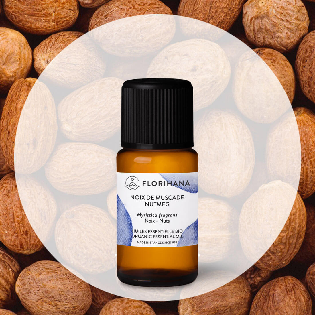 The Nutmeg Organic Essential Oil (Myristica fragrans) is certified organic, 100% pure and natural. It is obtained by steam distillation of the nuts. This plant is cultivated in Sri Lanka and Indonésia.