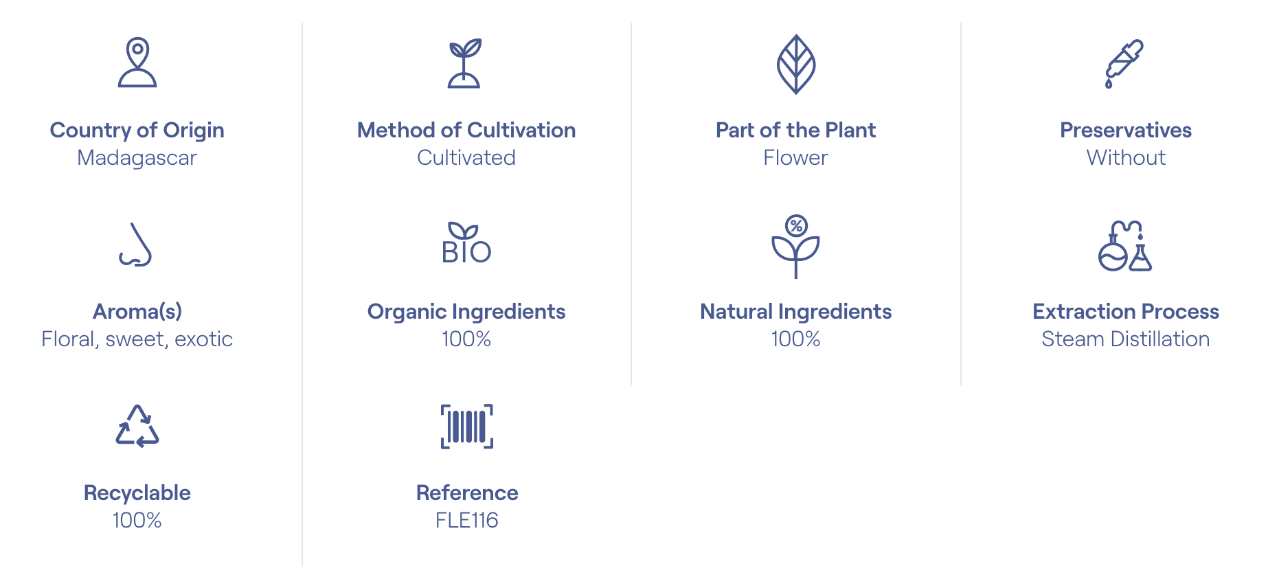 The Ylang Ylang Complete Organic Essential Oil (Cananga odorata) is certified organic, 100% pure and natural. It is obtained by steam distillation of the flower. This plant is cultivated in Madagascar.